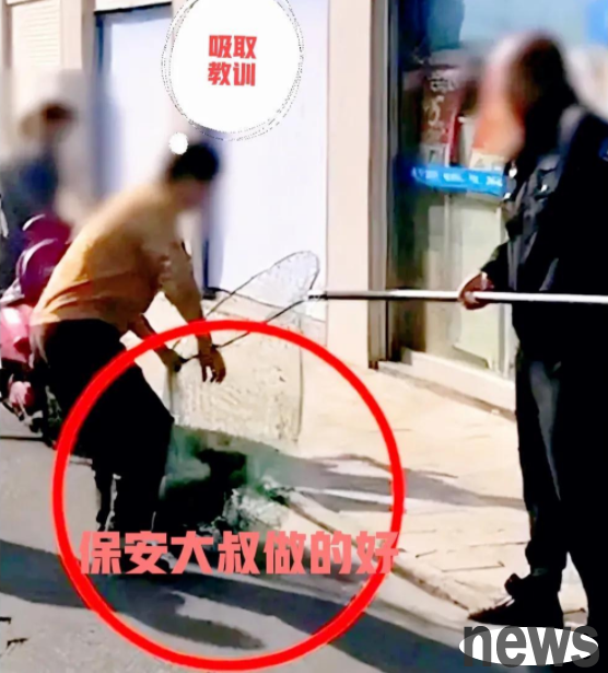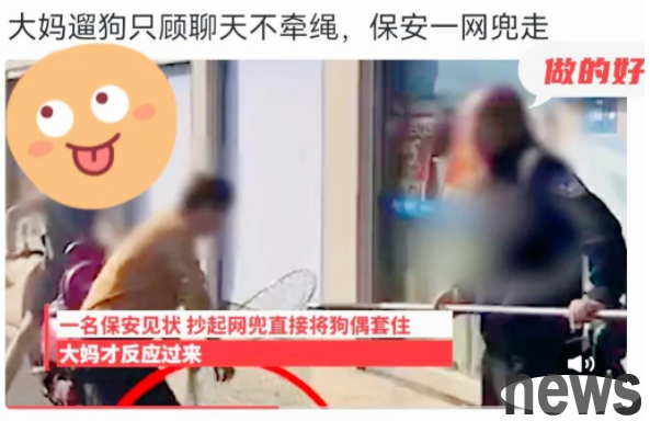 On September 26, an aunt in Xiangyang, Hubei Province took her pet dog out for a walk. She only talked with others. The pet dog did not have a leash and ran around everywhere, but she did not care. Upon seeing this, a security guard picked up a net bag and trapped the dog directly. Only then did the aunt react. I have to say that this security guard did a great job.