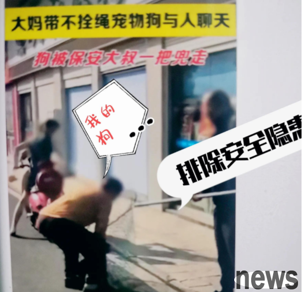 Regarding the aunt’s practice of walking her dog without a leash, the security guard’s behavior is legal, reasonable, and in compliance with regulations. Security uncle, this approach is to stop and prevent the harm caused by dogs.