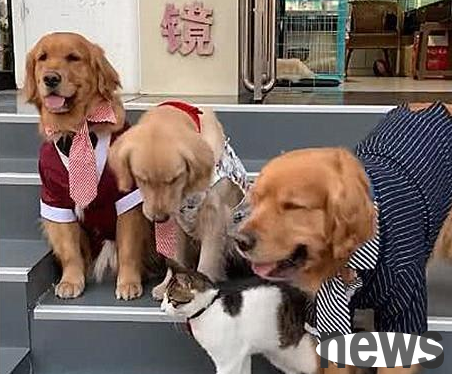 However, it is quite difficult to let cats and dogs live in harmony. This shit scraper is the legendary shit scraper with both cats and dogs. He has three golden retrievers and a cat. What kind of sparks will this combination create? One day, the scavenger wanted to take some family photos for them, so he dressed them up specially.