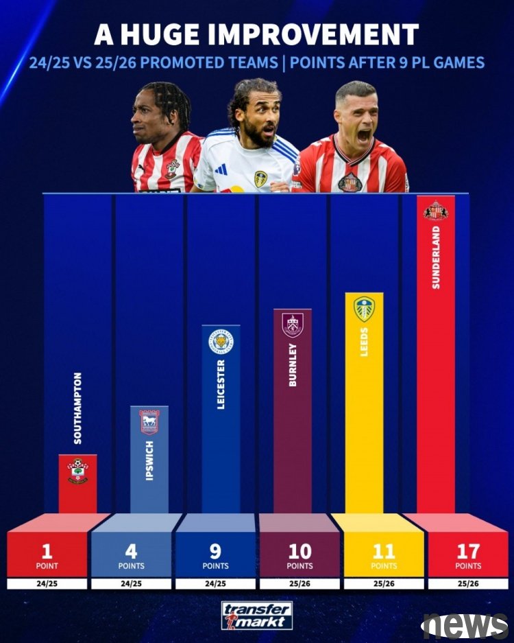 After 9 rounds of the Premier League, Sunderland ranks second in the standings, and the other two newly promoted teams also performed well. Statistics show that the three newly promoted teams in the Premier League this season have higher points than...