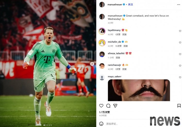 Bayern successfully reversed Freiburg in this round of Bundesliga with two behind and six, and captain Neuer also posted a photo of the game after the game to celebrate. Neuer posted a photo of his celebration with the text: "Great reversal! No...