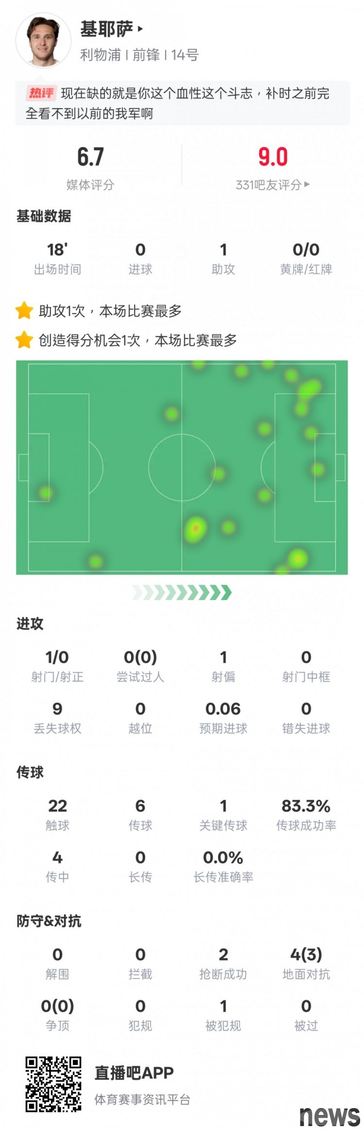The focus of the 8th round of the 2025-26 Premier League season, Liverpool 1-2 Manchester United at home. Chiesa came off the bench and sent out 1 assist, 1 key pass, and 2 steals, with a rating of 6.7.