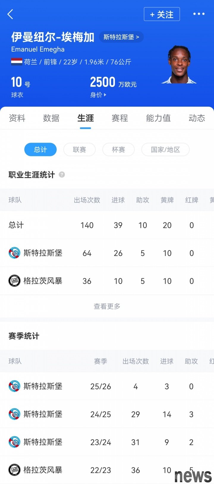 Dutch forward Emerga is 22 years old and 1.96 meters tall. He played 29 games for Strasbourg last season, scoring 14 goals and assisting 3 times. Currently, Emerga's German turnover price is 25 million euros.