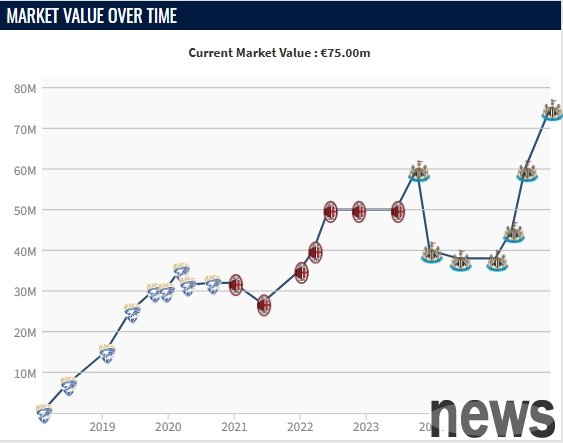 Tonali, who is currently playing for Newcastle, is worth 15 million euros to 75 million euros, becoming the second most valuable player in Italy, second only to Bastoni, who is worth 80 million euros.