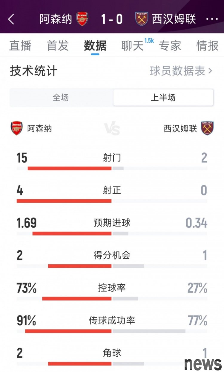 After the first half of the Premier League Arsenal vs. West Ham, Arsenal led 1-0 with Rice's goal. The following is the comparison of the half-time data of both sides: Arsenal vs. West Ham Shots: 15-2 Shots: 4-0 Expected goals: 1.69-0.34 Score c...