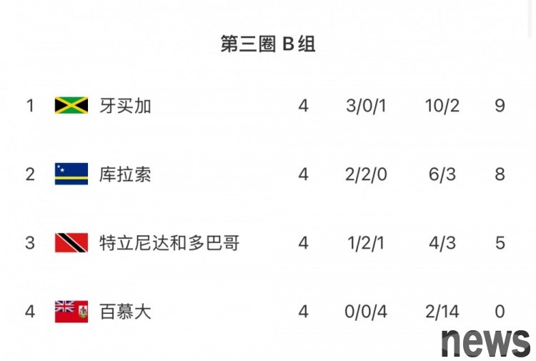 According to the promotion rules, the 12 teams in the third stage are divided into 3 groups, with 4 teams in each group participating in a double round-robin competition. The top team in each group will directly advance to the World Cup. On November 14, Jamaica will face Trinidad and Tobago, Curacao will face Bermuda, and Jamaica and Curacao will face off on November 19.