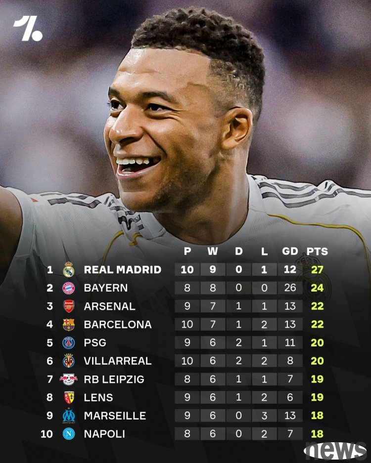 Onefootball has listed the standings of the five major leagues this season. Real Madrid leads the way with 27 points in 10 games, followed by Bayern with 24 points in 8 games.
