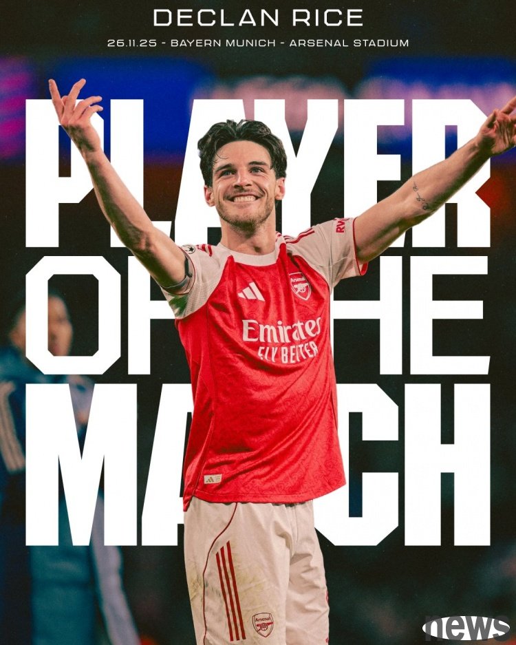 In the fifth round of the UEFA Champions League, Rice played the entire game and helped Arsenal defeat Bayern 3-1 at home. Arsenal officially announced that after fans voted, Rice was elected the best player in the Arsenal team in this game....
