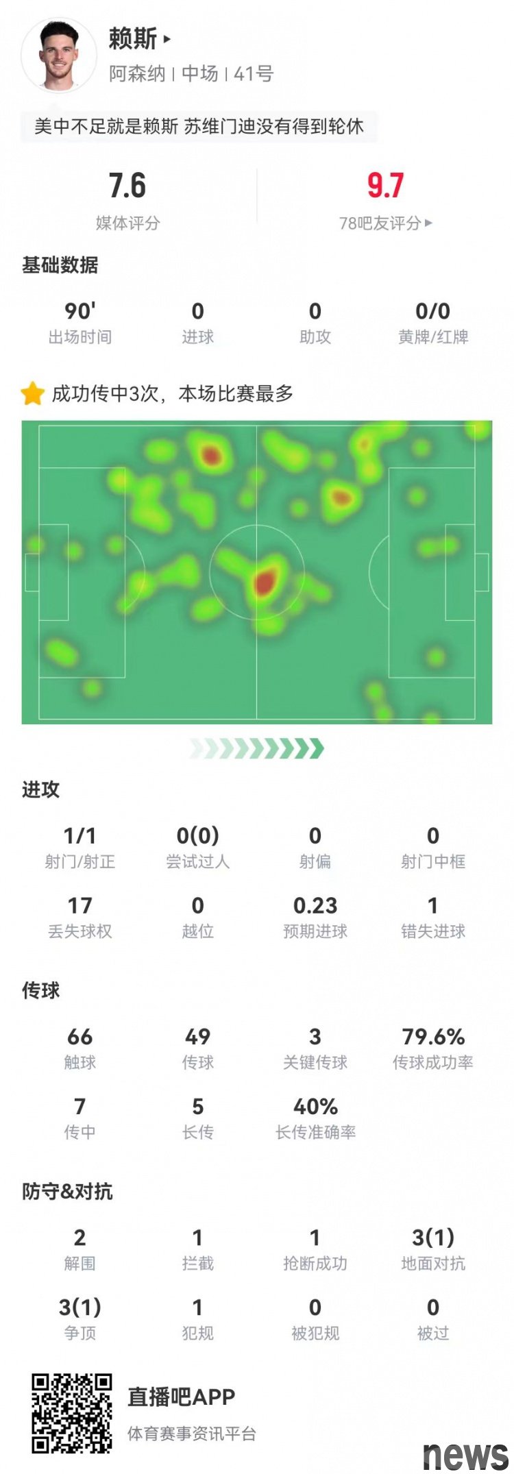 Arsenal officially announced that after fans voted, Rice was elected the best player in the Arsenal team in this game.